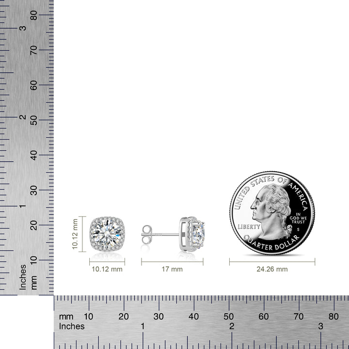 Elevate your elegance with these stunning halo stud earrings, meticulously crafted with 14K white gold plating on 925 sterling silver. Featuring a brilliant cushion-cut cubic zirconia center stone, encircled by a delicate halo of smaller shimmering stones, these earrings radiate timeless sophistication.